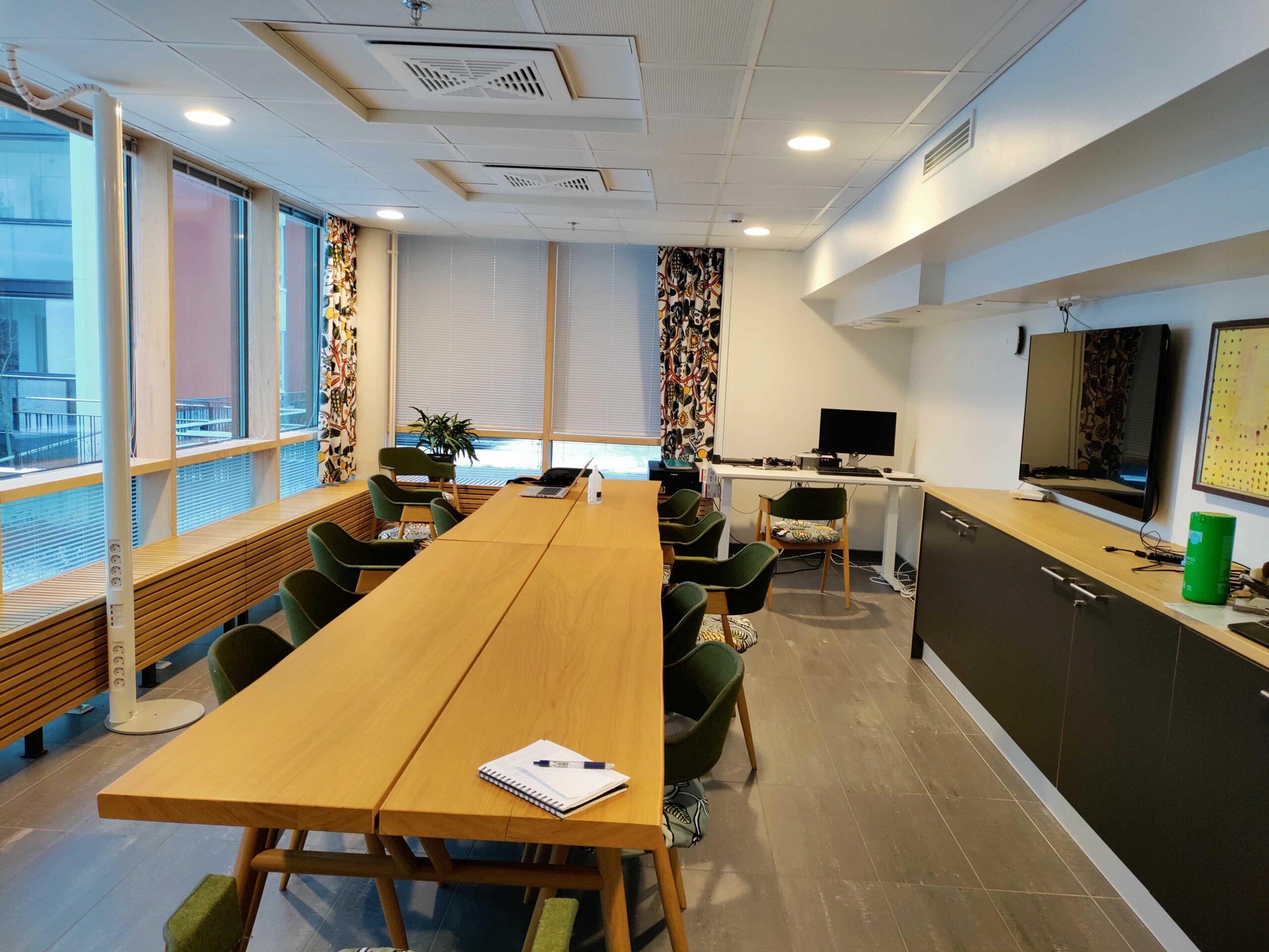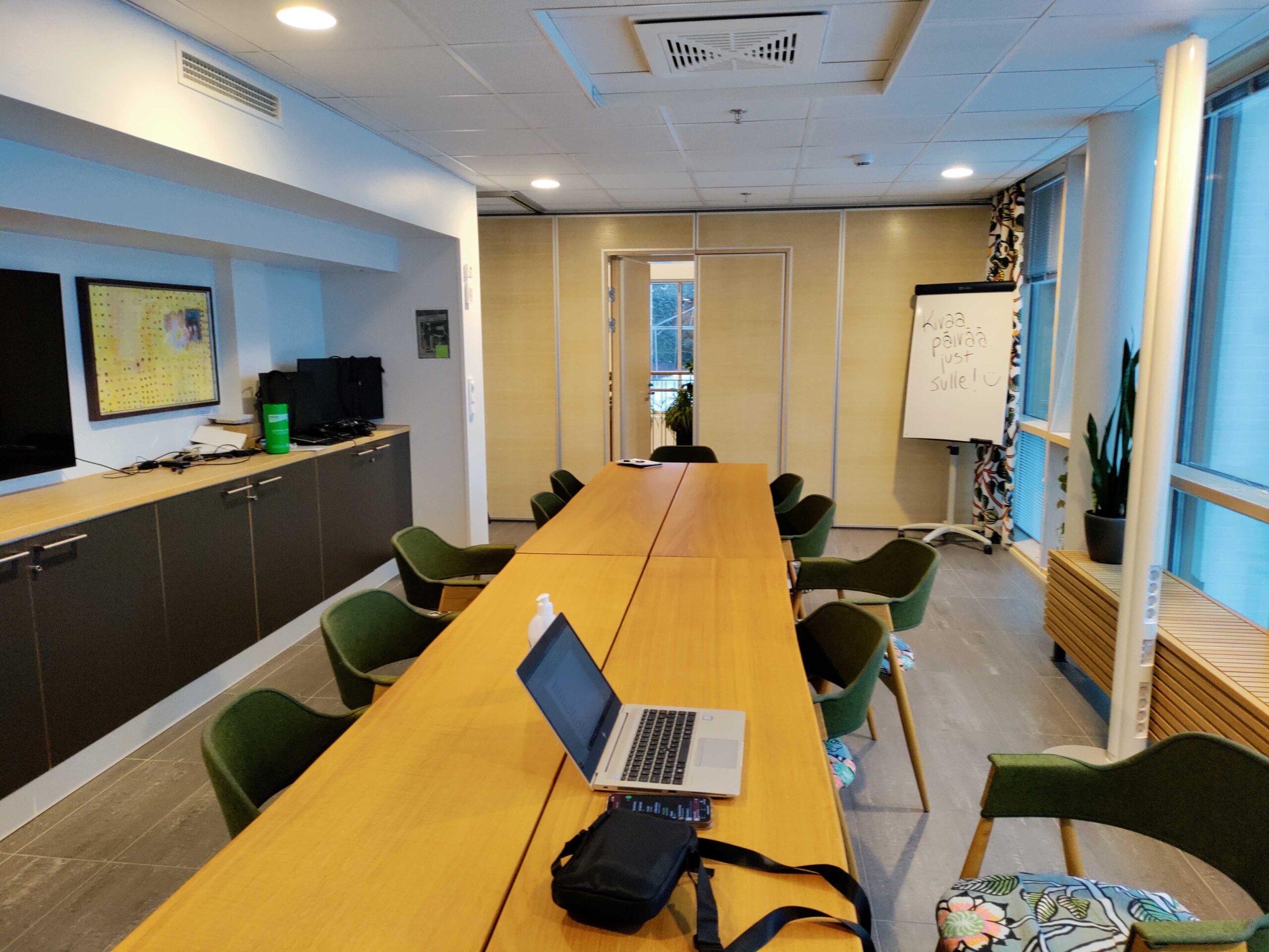 Kokoustekniikka: AV tekniikka hdmi-kaapeliyhteydellä, iso näyttö seinällä, fläppitaulu + tussit, wifi