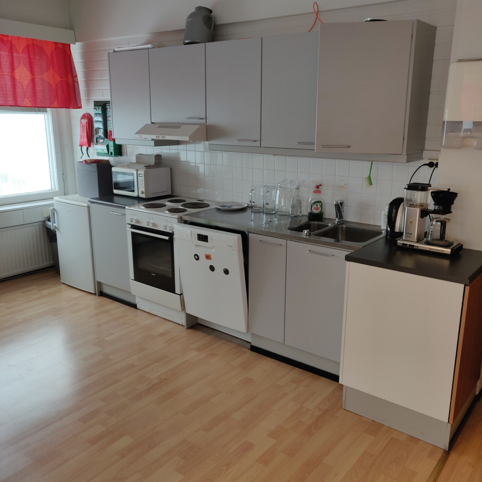 Kokoustarjoilut: Omatoiminen kokoustarjoilumahdollisuus. Tilassa on keittiö, jossa on kahvinkeitin, vedenkeitin, keittolevyt, mikro, jääkaappi, astioita ja keittiövälineitä
